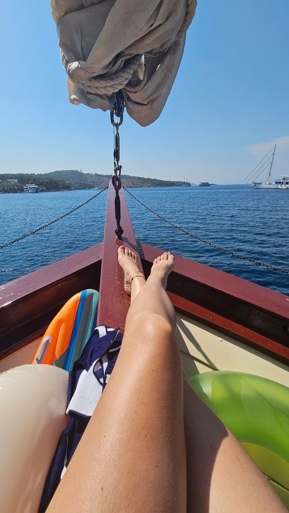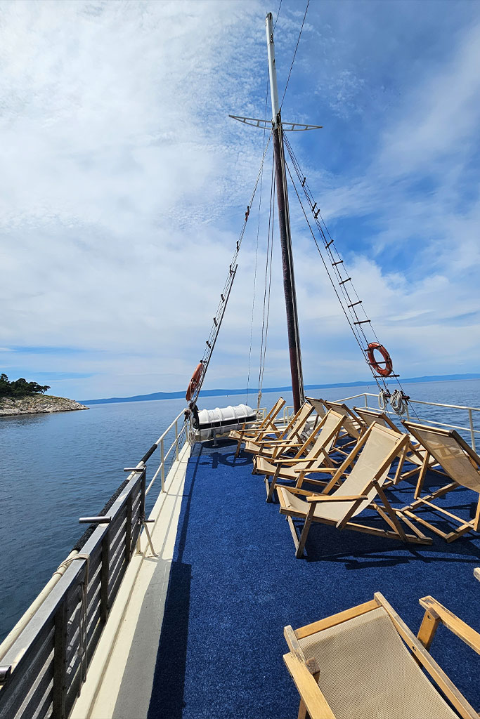 The first and, in our opinion, the best thing is that you are in a different place every day—doesn’t that sound amazing? The second thing is that you don’t have to go anywhere because everything is right at your fingertips. On the boat, you eat, drink, sunbathe… you don’t have to go to the beach because you’re already on the sea. For swimming, you only need to step down the stairs into the water, and those a little braver can jump straight off the boat into the sea.